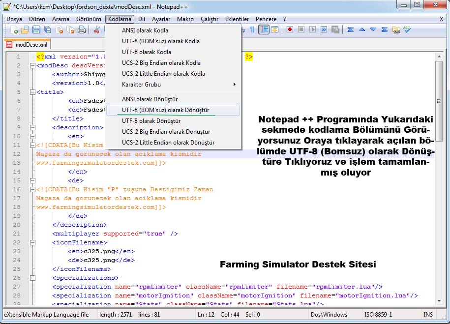 Utf değerimizi girdikten sonra Yukarıdaki Moddesc.xml dosyasını Düzenleme yaparken de yapmış olduğumuz işleme geçiyoruz. Notepad ++ program sekmelerinden kodlama bölüme tıklıyoruz ve UTF-8(Bom’suz olarak Dönüştür) e tıklıyoruz ve kaydedip çıkıyoruz.