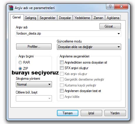 Alttaki Resimdeki Gibi açılan Winrar Penceresinde Zip olan bölümün yanındaki yuvarlağı işaretliyoruz ve Tamama basıyoruz.