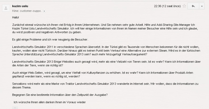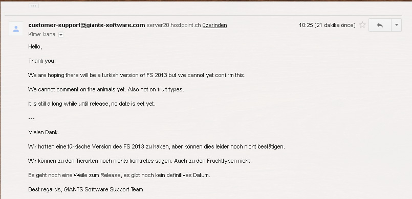 Sevgili Arkadaşlar Dün sizin ve kendim adına Farming simulator Yapımcı kadrosuna bir mail gönderdim . Mailde Türkçe Versiyon çıkacak mı ? , Hayvan çeşitleri kesinleştimi ? , Traktör markaları hakkında bilgi var mı ve tam çıkış tarihi kesinleştimi gibi sorular yönelttim. Sağolsun Giants Software Çalışanları o kadar işlerinin arasında maile kısa sürede cevap ilettiler. Cevabıda çok geçmeden sizinle paylaşmak istedim.Öncelikle Resimlere tıklayarak büyütebilirsiniz.
